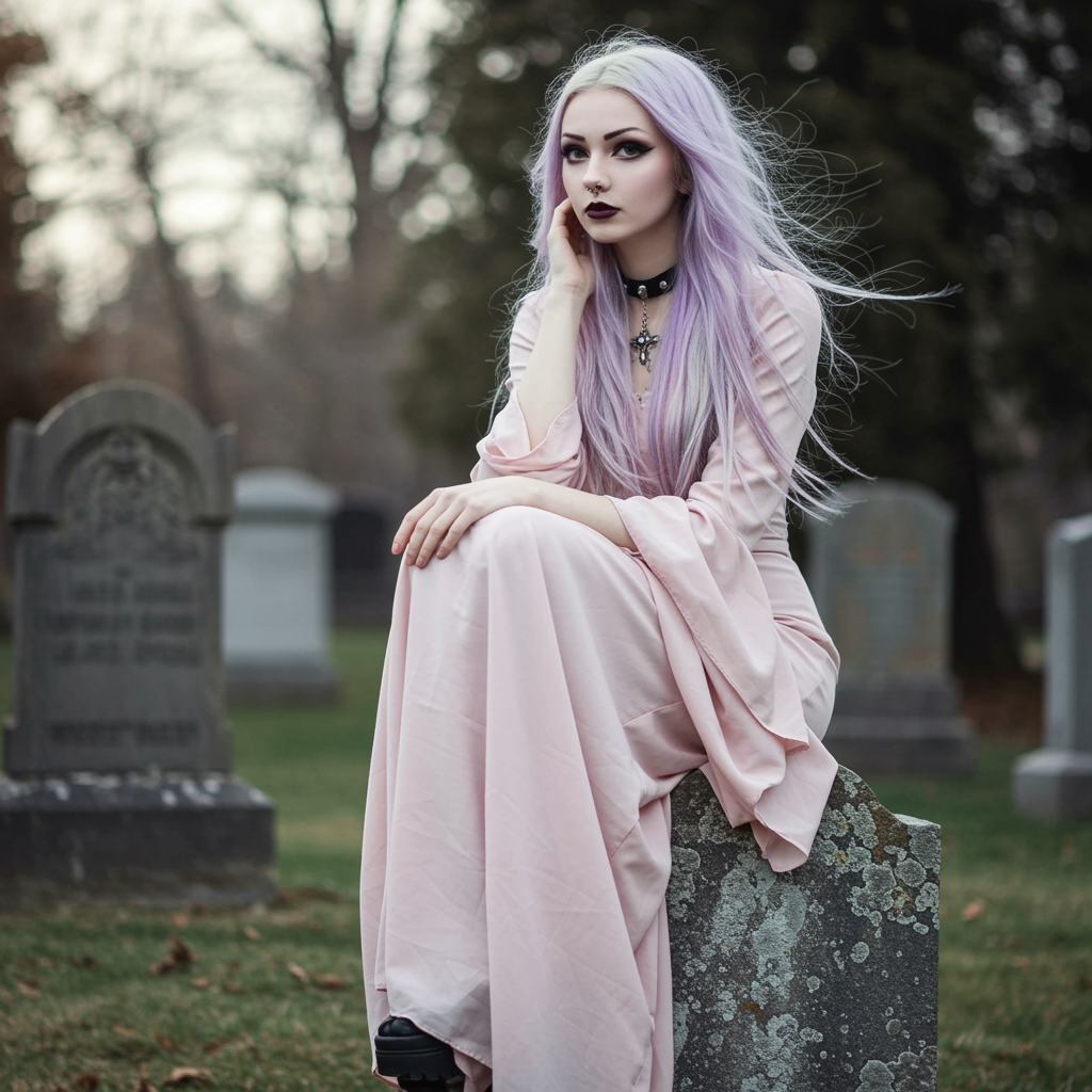 A pastel goth with black metal influences, draped in flowing pale pink attire, sits elegantly on a weathered tombstone. Her skin is ethereal, almost luminescent, as intense direct sunlight cascades across her face from the side, creating dramatic shadows and highlights. Her eye makeup is bold and dark, contrasting with her lack of eyebrows, adding to her enigmatic aura. Her hair, an ethereal blend of pastel hues, dances in the wind. The scene captures the haunting beauty of gothic elegance, framed by the nostalgic grain of kodak portra 800 film.