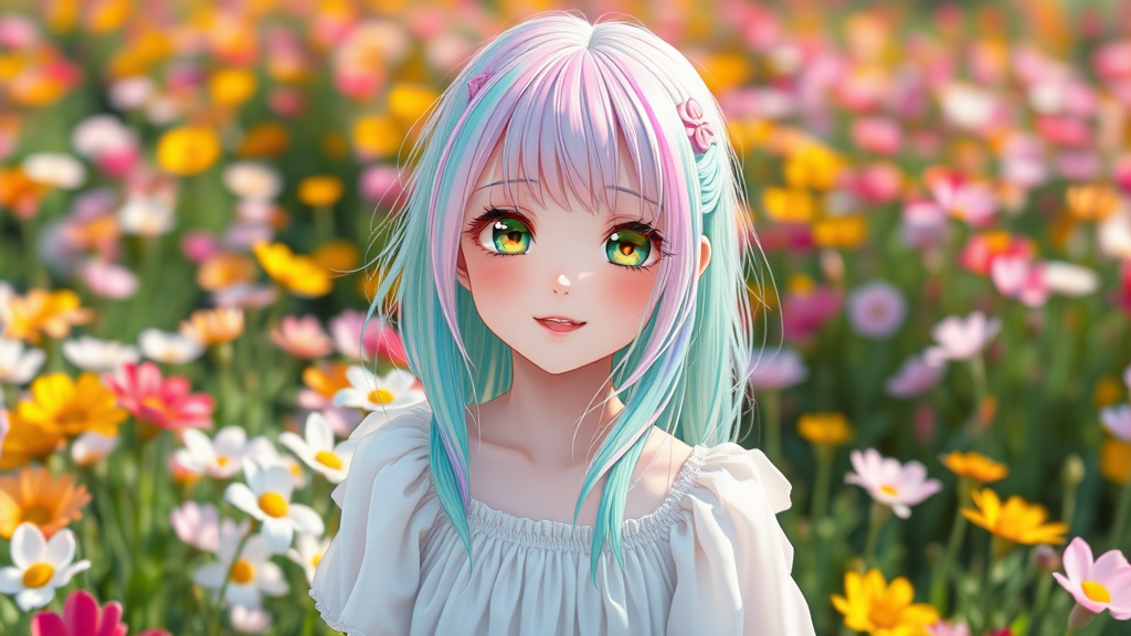 A pastel rainbow-haired girl with captivating olive green eyes and a light rainbow and white dress stands joyfully in a vibrant flower field. Her anime-style features highlight her enchanting aura, complemented by her cute smile and an overall happy mood. She exudes a perfect Iris-like beauty, with a graceful presence and harmonious proportions, seamlessly blending with the colorful blossoms around her. Her expression radiates warmth and charm, creating a picturesque scene that is both elegant and whimsical.