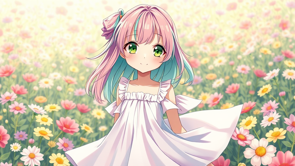 A pastel rainbow-haired girl with captivating olive green eyes stands gracefully in a vibrant flower field. Her light rainbow and white dress flows gently around her, complementing her enchanting presence. She exudes a happy mood, her cute smile radiating warmth and joy. The scene is captured in a perfect anime style, emphasizing her charm and the serene beauty of her surroundings.