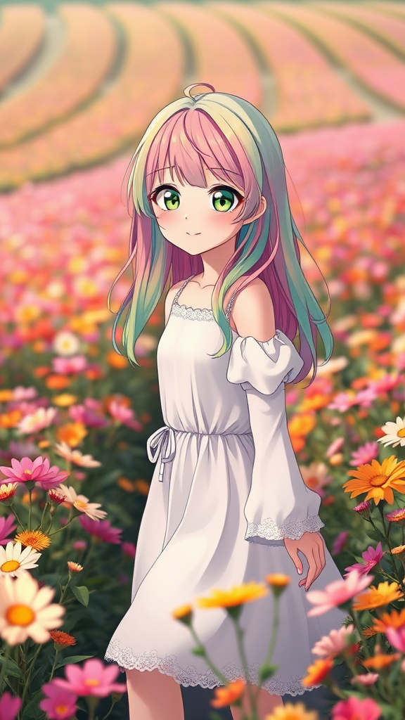 A pastel rainbow-haired girl with stunning olive green eyes wearing a light rainbow and white dress happily wanders through a vibrant flower field. Her anime-style features and cute smile convey a joyful mood. The scene captures her elegance and charm amidst a harmonious and picturesque landscape, emphasizing natural beauty and serene happiness.