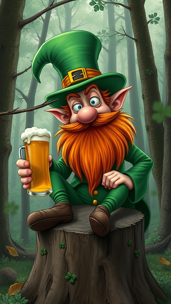 A peculiar leprechaun with tangled red beard clutching a frothy mug of beer is amusingly whacking himself on the head with a twig, perched on a rustic stump amidst a dense forest, captured in the whimsical and satirical style of Herluf Bidstrup for a quirky St. Patrick's Day scene. Reminiscent of a Weird Al Yankovic flair, the scene exudes mid-2000s nostalgia, complete with grainy texture akin to a 2000s camera snapshot. The artwork is hyper-realistic, showcasing an astonishing level of detail in the leprechaun's animated expression and intricate features, trending on artstation. The image includes both a headshot and full body view, allowing a thorough appreciation of the character's lively face and eccentric antics.