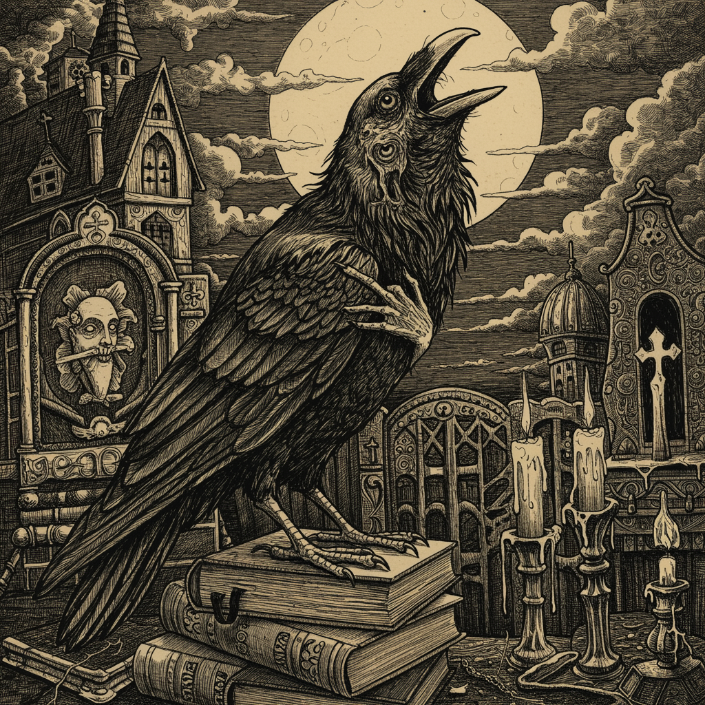 A pen and ink drawing inspired by Edgar Allan Poe features an open-beaked, squawking raven perched atop a pile of books. The scene is set under a full moon partially obscured by clouds, casting an eerie and gloomy illumination. Intricate and extreme details highlight the gothic horror atmosphere, with a moody and dramatic ambiance. The raven's eyes are unsettling, with deformed irises and pupils that appear cross-eyed, adding to the unsettling vibe. The bird's face seems cloned, sporting extra, mutated features, including additional fingers and an elongated neck. The composition includes cropped elements, low-resolution textures, and subtle jpeg artifacts, giving it a slightly aged, mysterious quality. Subtle indications of a signature, watermark, or artist's mark may be perceived, blending into the background. Despite its apparent chaos, the piece remains strikingly detailed, presented in UHD and HDR quality.