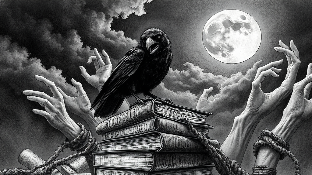 A pen and ink drawing inspired by Edgar Allen Poe, featuring a raven with an open beak, caught mid-squawk atop a pile of ancient, dusty books, under a full moon partially obscured by swirling clouds. The scene exudes Gothic horror, with extreme and intricate detail, showcasing an eerie, gloomy illumination. The composition is intensely moody and dramatic, rendered in rich 16k UHD and HDR quality, capturing the essence of brooding darkness. The raven has deformed irises and pupils, its eyes appearing cross-eyed, contributing to the unsettling atmosphere. The setting includes cloned facial features hidden in shadows, extra fingers appearing to grasp the books, and mutated, elongated hands reaching from darkness. The scene is filled with eerie distortions: an unusually long neck and features that seem slightly out of frame, suggesting an otherworldly presence. The atmosphere is dense with mystery, devoid of any modern distractions or artifacts, reminiscent of an untitled, artist-name-free classic from a forgotten era.