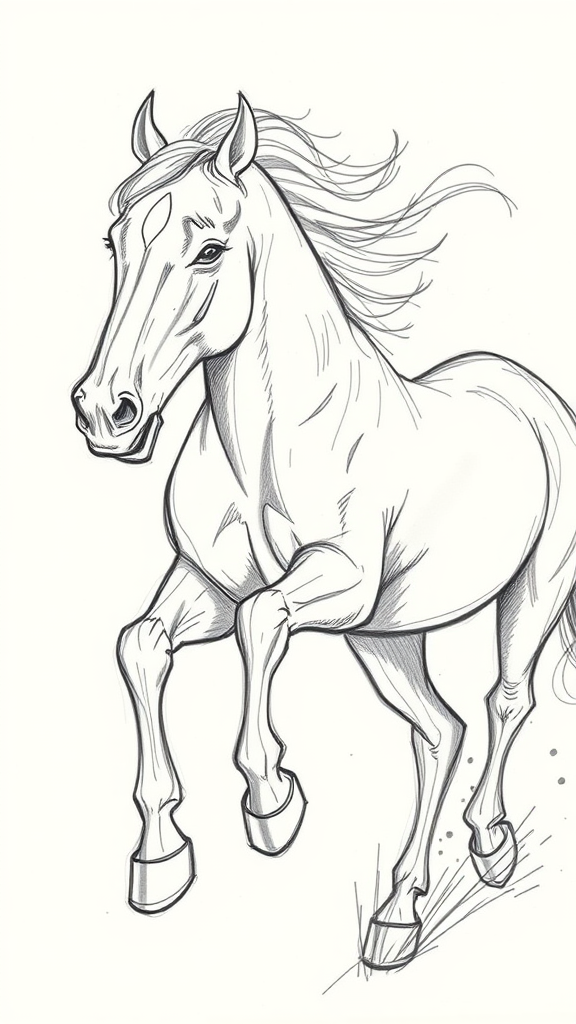 A pencil drawing of a galloping horse, featuring dynamic, bold, and gestural strokes, with expressive facial characteristics. The rendering captures the horse's raw energy through large, sweeping brushstrokes and loose, calligraphic gestures. This characterful portrait showcases animated movement and vitality with its gestural composition. The strokes are both loose and intentional, emphasizing the horse's spirited essence.