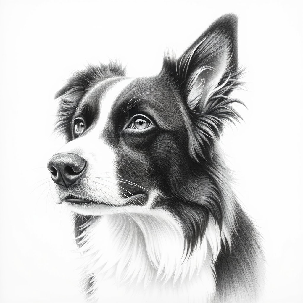 A pencil sketch of a border collie dog portrait, featured on ArtStation, captured in sharp focus like a studio photograph, showcasing intricate and highly detailed features, inspired by the style of Greg Rutkowski, with a playful twist emphasizing the dog's expressive eyes and lively fur texture.