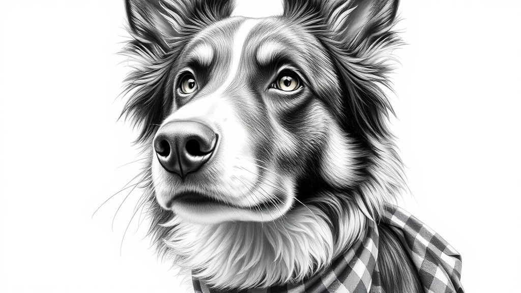 A pencil sketch portrait of a border collie dog, inspired by trending artwork on ArtStation, featuring sharp focus and a studio photo style. The drawing showcases intricate details and high realism, capturing the expressive eyes and textured fur. The image includes subtle embellishments like gentle shading to highlight the contours and a slightly whimsical addition of a flowing bandana around the dog's neck, adding a touch of personality. The style is reminiscent of the highly detailed techniques of Greg Rutkowski, yet offers a unique interpretation with a blend of classic realism and a hint of artistic flair.