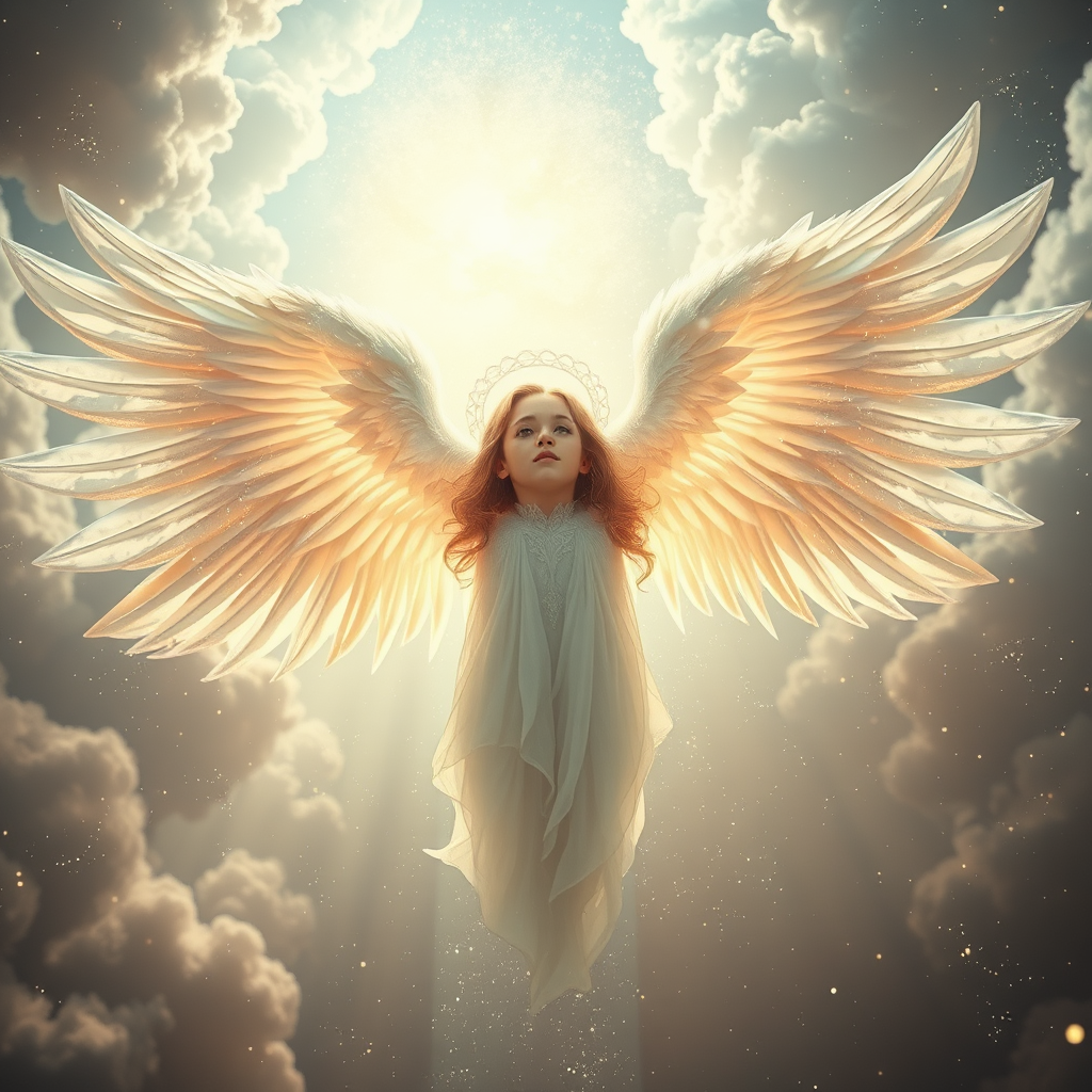 A perfectly-centered photograph of a majestic divine being with ethereal wings gracefully descending from the heavens, embodying elements of fantasy, magic, and dream-like serenity. The scene captures a blend of D&D inspiration with shimmering, gentle particle effects, viewed through a wide-angle lens. The background is intricately detailed, evoking a lifelike, immersive atmosphere. The being's face is finely detailed, reflecting the mastery of a professional digital painting. Drawing inspiration from the styles of ArtStation, the artwork is a blend of pastel colors with photorealistic elements, enveloped in crisp lighting that enhances its beauty. The composition is trending on Tumblr, influenced by the artistic prowess of creators like Artgerm, Greg Rutkowski, Alphonse Mucha, Loish, and WLOP. The piece exudes elegance and harmony, with each detail contributing to the overall celestial and enchanting aura.