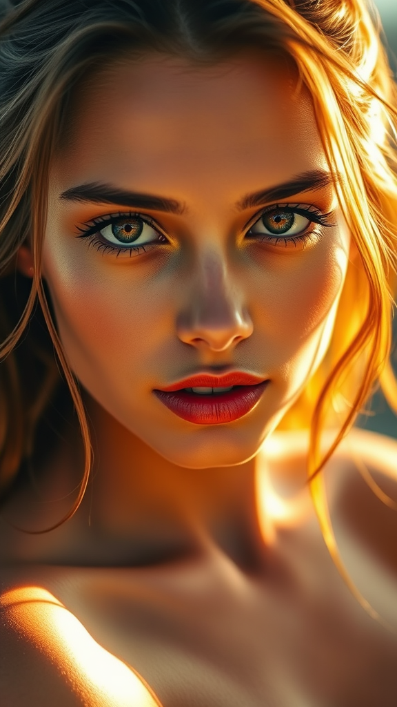 A perfumed and alluring young woman, bathed in radiant golden light, her skin effortlessly smooth and luminous, beckons the viewer with a look that's equal parts captivating and sensual, frozen in a near-natureial pose within a beautifully detailed frame.