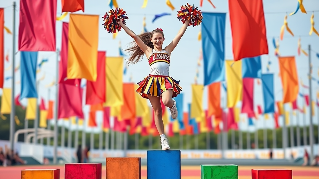 A person dressed as a cheerleader balancing skillfully on a series of colorful stepping stones with pom-poms raised high and a vibrant backdrop of fluttering banners.