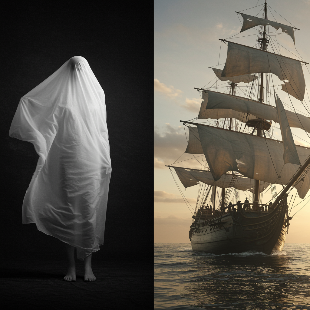 A person enveloped in a material resembling a shroud, seamlessly merging with the surrounding air, set against a dark backdrop that contrasts sharply with the luminous and radiant texture of the material, evoking a sense of emergence or transformation. The scene is infused with monochromatic tones to amplify the mysterious and intense atmosphere. Nearby, a hyper-realistic sailing ship is depicted with dramatic lighting at pale sunrise, featuring cinematic light and battered sails. The perspective is low angle, with extreme detail and focus, evoking the style of artworks trending on art platforms. The scene combines the intricate art styles reminiscent of Studio Ghibli and John William Turner, presenting a vivid masterpiece that bridges ethereal emergence and nautical grandeur.