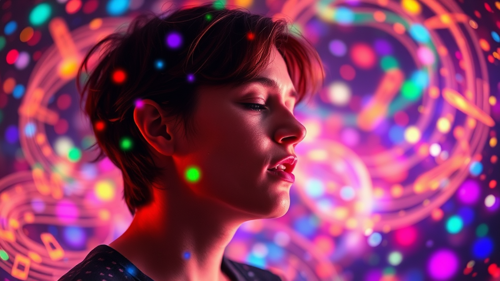 A person experiencing synesthesia while immersed in their favorite song, where the notes transform into a vibrant tapestry of colors and shapes. The music swirls around them, each note painting a brushstroke of luminous hues across their vision, evoking a sense of wonder and beauty at the magical crossing of senses. They see sounds and hear colors, with light particles dancing in the air, creating a mesmerizing display. Despite occasional blurriness, this dazzling symphony of colorful sensations enchants them, transcending ordinary perception and casting a spell of breathtaking wonder.