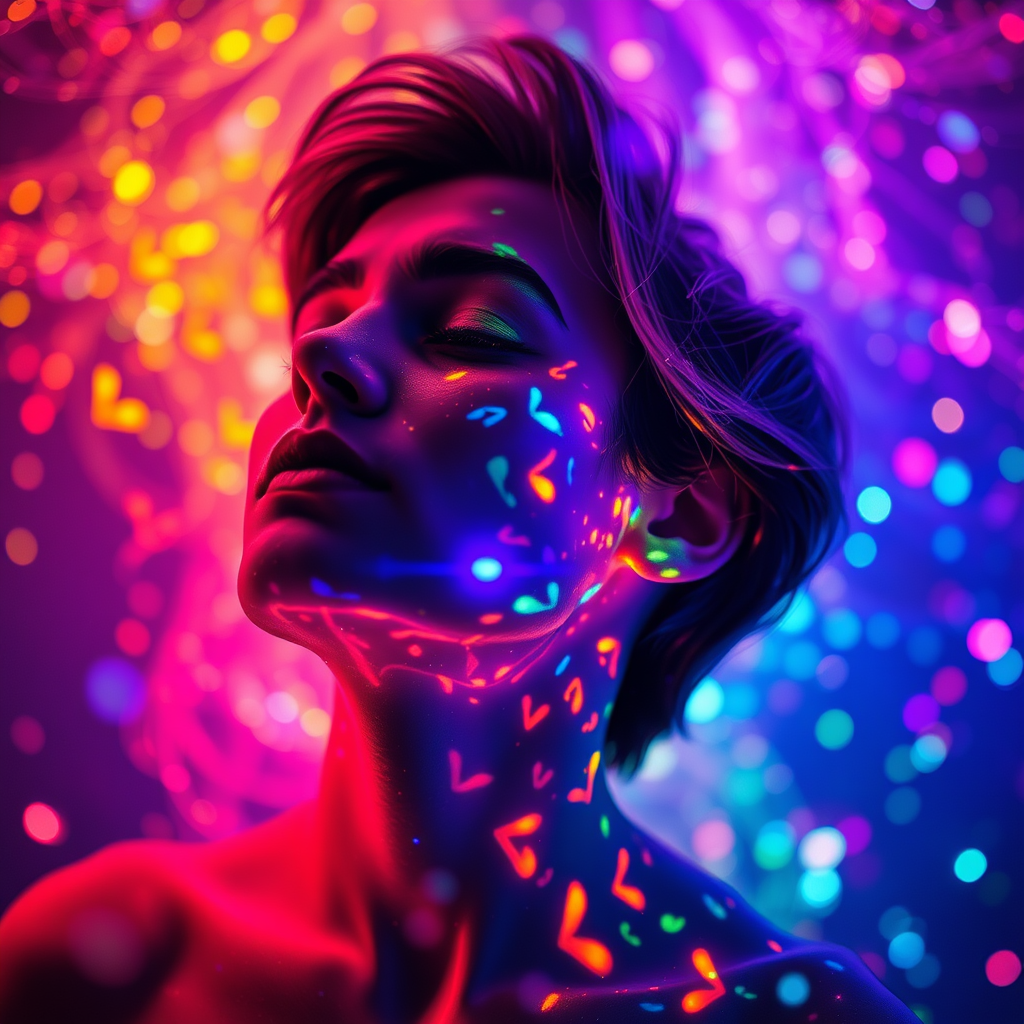 A person feels a sense of wonder and beauty as they experience synesthesia while listening to their favorite song, their senses blending seamlessly to reveal a colorful tapestry of shapes and hues that dance with the rhythm of the music. Vibrant light particles shimmer around them, creating an ethereal depth of field that enhances the vividness of each note. Intricate rim lighting highlights the vibrant flow of colors, painting a mesmerizing picture that fills the room. The experience is surreal, a breathtaking immersion into an enchanted world where sight and sound intertwine, each pulse of the melody sparking new bursts of kaleidoscopic beauty in a harmonious blend of sensory delight.