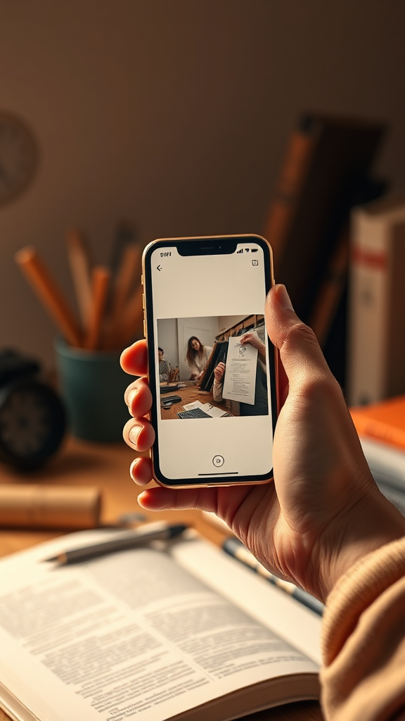 A person gently holding an iPhone displaying an image, set in a minimalist and realistic style, exuding the essence of study inspiration. The scene captures a serene study environment with warm lighting, as subtle academic elements surround the phone in the background. Executed in a raw and authentic manner, the image offers a glimpse into a focused and calm atmosphere, evoking the essence of modern student life.