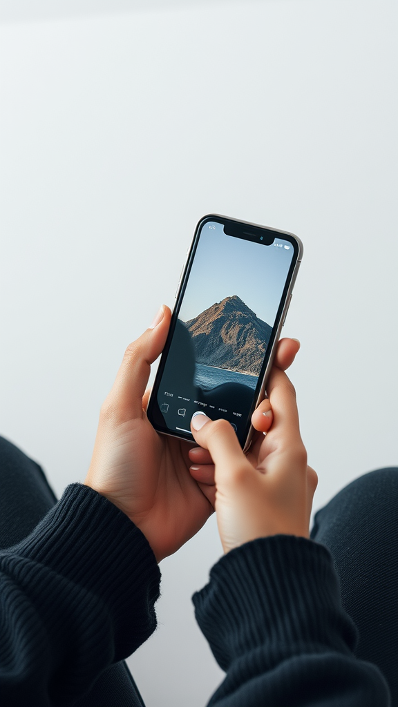 A person gently holds an iPhone displaying a captivating image, set against a minimalist and realistic backdrop, echoing the aesthetic of studyblr style. The composition embraces a raw, authentic approach, with an emphasis on simplicity and clarity. The scene balances subtle creativity with a focus on the core concept, capturing a blend of modern technology and artistic expression.