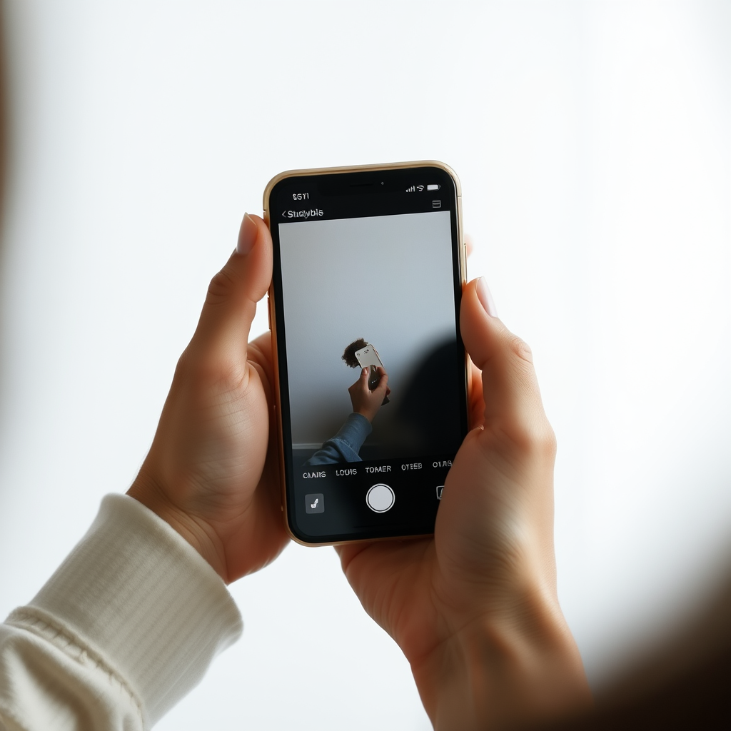 A person holding an iPhone displaying an image, characterized by minimalist and realistic elements, evoking a studyblr aesthetic, with the scene captured in natural light and soft focus, showcasing a raw and authentic style.