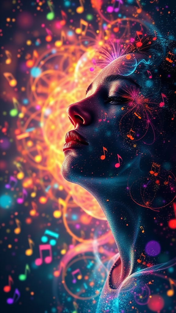 A person immersed in synesthesia while listening to their favorite song, experiencing a magical blending of senses where vibrant colors and intricate shapes dance before their eyes with each note. The music weaves a tapestry of visual wonder that surrounds them, a mesmerizing interplay of sound and sight. Light sparkles with ethereal quality, painting the air with an exquisite palette that shifts and sways rhythmically. This enchanting experience evokes a profound sense of beauty and awe—a transcendent crossing of senses where every tone conjures a cascade of hues and every melody reveals a vibrant landscape of auditory colors. The world becomes a vivid symphony, a place where the boundaries between sight and sound blur into a harmonious and colorful sensory journey.