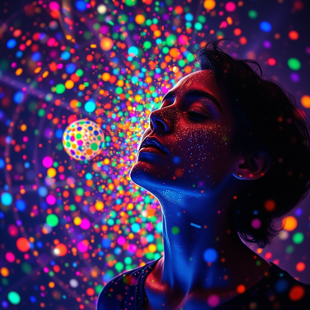 A person immersed in the ethereal experience of synesthesia while their favorite song plays, where each note radiates vibrant colors and intricate shapes. As the music fills the air, bursts of vivid hues dance before their eyes, transforming sound into a captivating visual symphony. Each tone paints the space with light particles, creating a kaleidoscope of wonder and beauty. The merging of senses is a mesmerizing journey, where colors can be heard and sounds can be seen. This awe-inspiring crossing of perceptions transports them into a realm of infinite creativity, where music and color intertwine in breathtaking harmony.