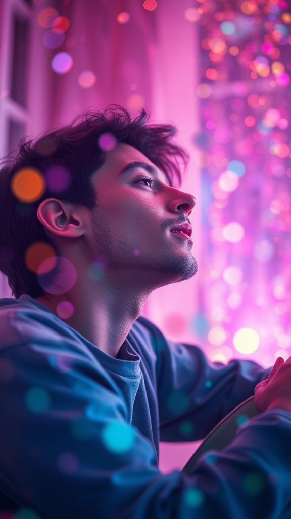 A person immersed in the vibrant world of synesthesia as they listen to their favorite song, where melodies transform into a kaleidoscope of colors and shapes. Each note conjures a dance of bright hues and delicate patterns that weave through the air with a mesmerizing fluidity, evoking a profound sense of wonder and beauty. The scene is bathed in soft, ethereal light, with particles glimmering like stars around the listener, who sits ensconced in a serene environment. The focus on their enraptured expression captures the depth of their experience, while the background blurs gently, emphasizing the vivid display of colors in their mind. The atmosphere is enchanting and dreamlike, filled with a magical aura that celebrates the extraordinary blend of senses.