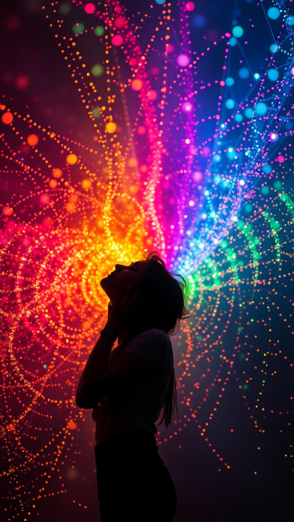 A person immersed in their favorite song experiences a mesmerizing fusion of senses, where the music conjures vibrant colors and dynamic shapes in their mind. As melodies unfold, rich tapestries of hues dance before their eyes, each note a brushstroke on an ever-changing canvas. They feel as if they are floating through a dreamscape, where sounds appear as waves of shimmering light particles, creating a sense of wonder and awe. The music paints a symphony of colors, igniting a kaleidoscope of emotions that sweep through them. Every chord resonates with a unique shade, and the rhythm pulses in vivid patterns, crafting an unparalleled sensory journey.
