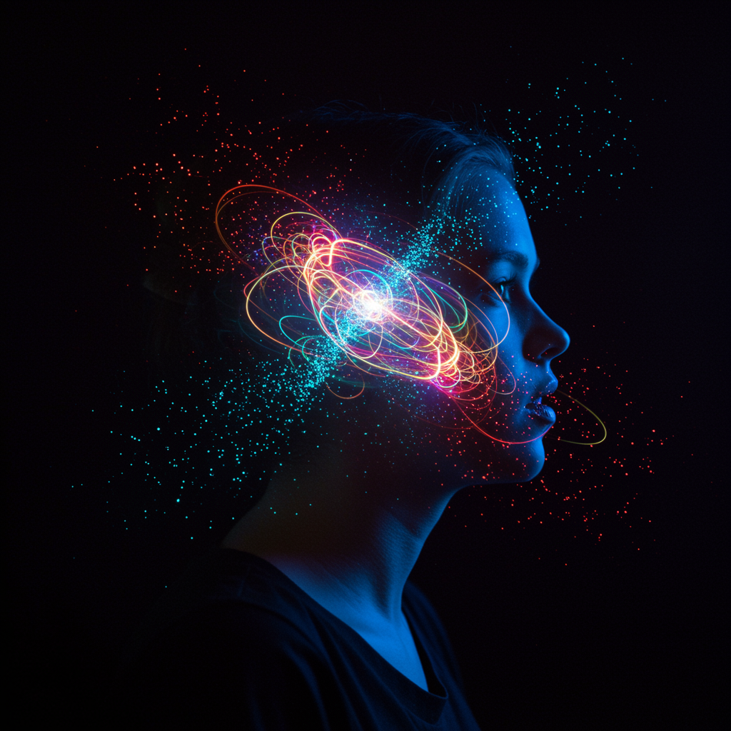 A person immersed in their favorite song, experiencing a vibrant synesthesia where sounds manifest as swirling colors and intricate shapes dance before their eyes. This sensory symphony creates an ethereal landscape where melodies shimmer as iridescent light particles and harmonies weave into vivid, kaleidoscopic patterns. Each note unfurls into a hue of its own, crafting a tapestry of wonder and beauty. The crossing of senses evokes an enchanting experience where colors are heard and sounds are seen, blurring the boundaries between reality and imagination. In this captivating sensory dance, the music paints a rich, intangible masterpiece that transcends ordinary perception, inviting the soul to explore a realm where sight and sound are one, unfettered by the limitations of the physical world.