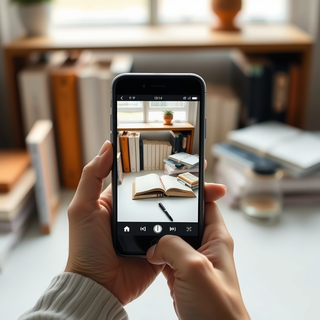 A person is holding an iPhone displaying a realistic, minimalist image captured in a study environment, characterized by clean lines and a serene atmosphere. The phone's screen shows an elegantly detailed and softly lit scene, similar to the studyblr aesthetic, with elements like neatly arranged books and a soft-focus background. The image conveys a sense of calm and focus, highlighting the simplicity and beauty of a well-organized workspace.