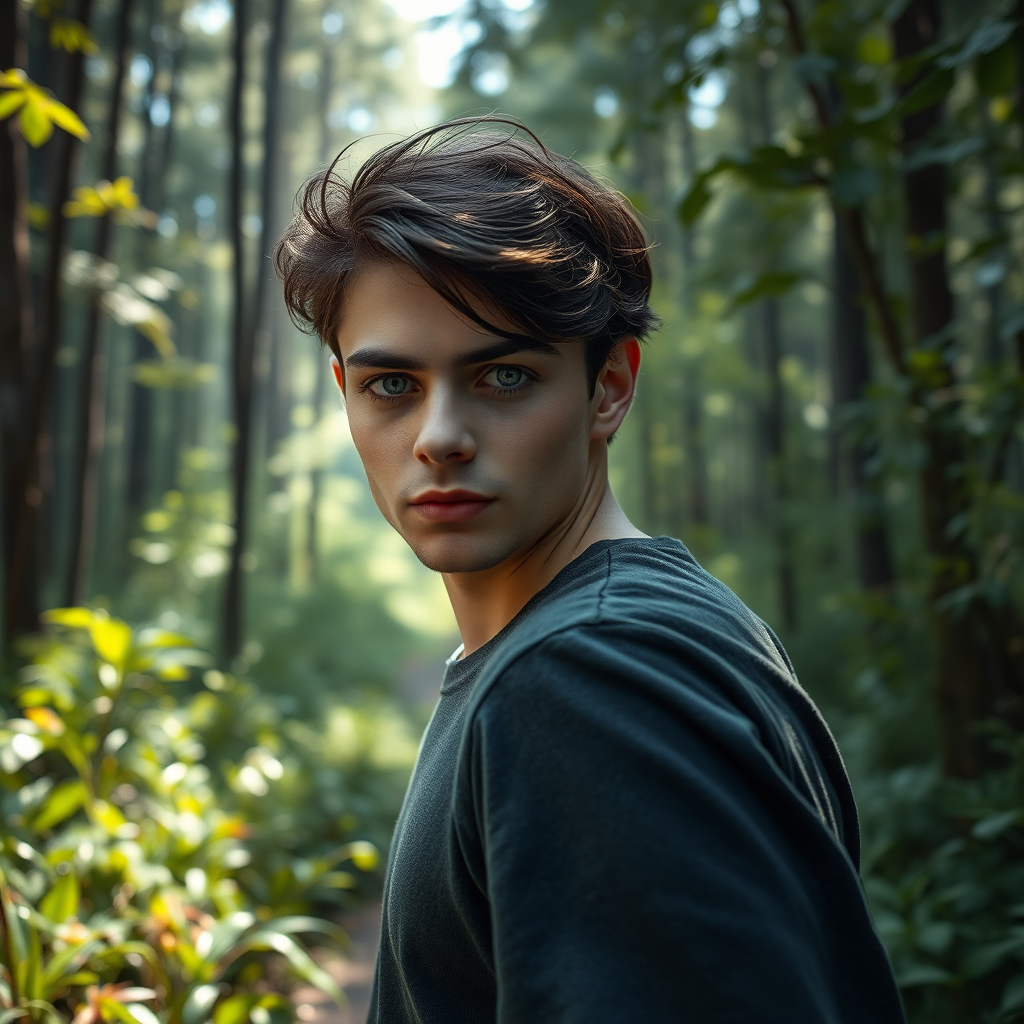 A person is walking through a lush forest, their beautiful, detailed eyes capturing the essence of nature's splendor. The scene is captured in a high-detail RAW color photo that boasts professional, close-up precision, showcasing ultra-high resolution and a highly detailed composition perfect for an 8K wallpaper. The image features physics-based rendering and cinematic lighting, exuding a CGI, 3D quality. The serene forest setting is devoid of any digital imperfections such as low resolution, text errors, or artifacts, maintaining a flawless presentation free from any distracting elements like watermarks or annotations. The subject, perfectly proportioned and naturally integrated into the scene, embodies a sense of harmony and connection with the surrounding wilderness.