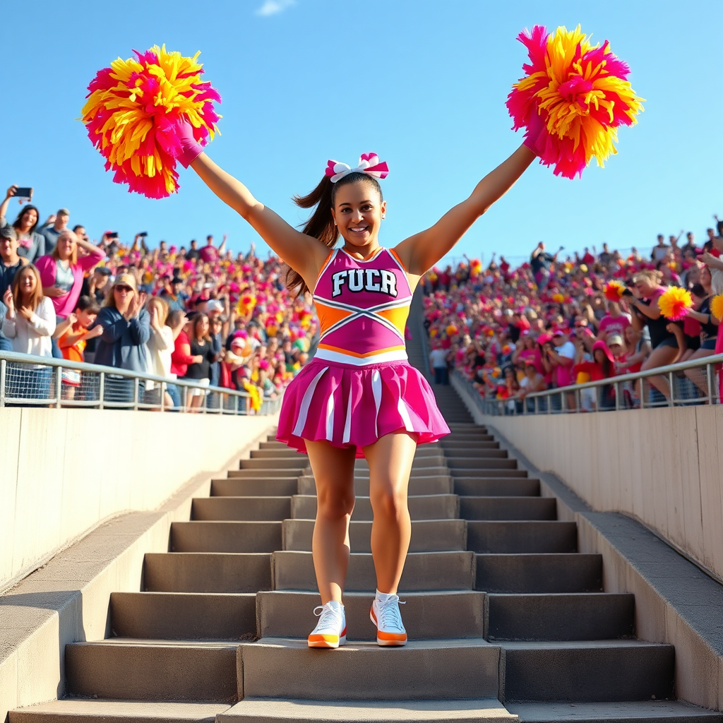 A person outfitted as a cheerleader stands confidently on a series of stepping stones, brightly colored pompoms raised high, surrounded by a vibrant sea of cheering supporters.
