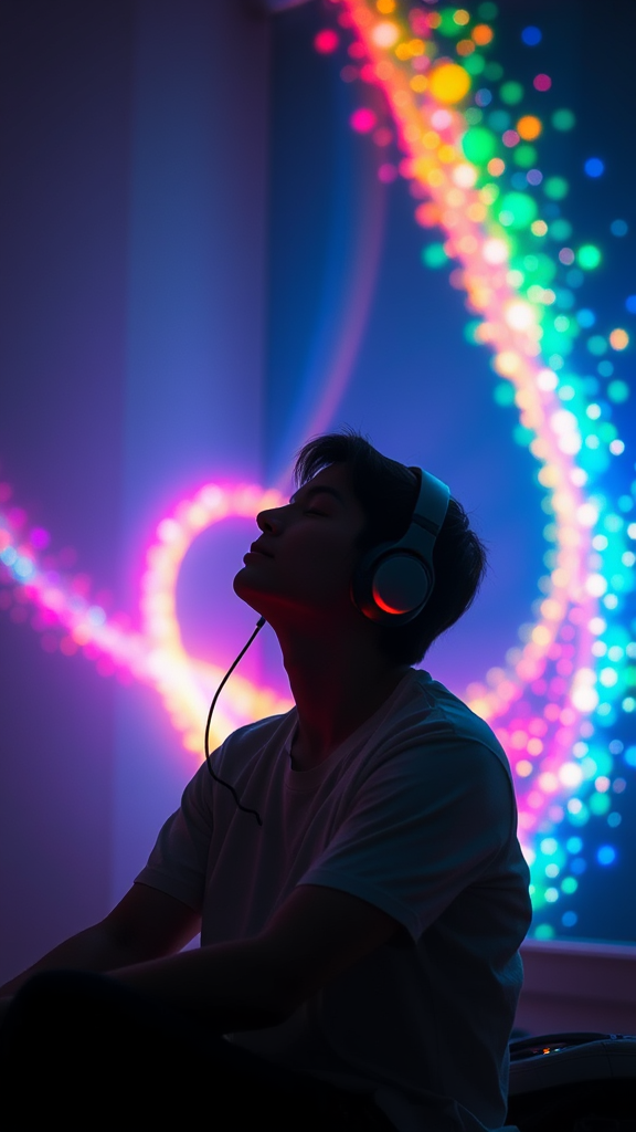 A person sits in a dimly lit room, their eyes closed, as their favorite song flows through their headphones. As the melody unfolds, vibrant waves of color dance before their mind's eye, a gentle cascade of blues and purples blending seamlessly into radiant yellows and reds. The notes are not just heard but seen; each chord resonates with a shimmering hue, while the rhythm produces a kaleidoscope of shifting shapes, swirling together in perfect harmony. Light particles seem to float in the air, creating an ethereal atmosphere that blurs the line between sight and sound. The experience evokes a profound sense of wonder and beauty, where every musical note becomes a brushstroke in an ever-changing masterpiece. The blending of senses paints a vivid tapestry of emotion and sensation, deepening the appreciation of the music's complexity and magic. Despite the lack of clarity in the room, the feeling of being enveloped in a world of pure, colorful sound is unmistakably vivid and captivating.
