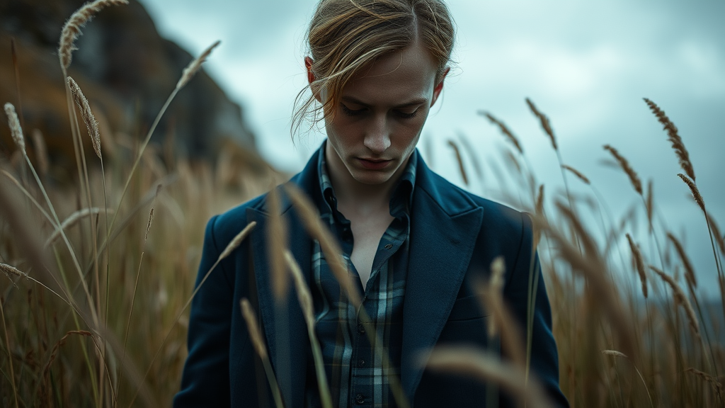 A person stands amid tall grass, head slightly bowed, embodying a fashion photography aesthetic intertwined with the essence of Scottish landscapes. The scene is painted in tones of light bronze and deep blue, highlighting deconstructed, gender-neutral tailoring. The close-up perspective captures a brooding atmosphere, where elements blend seamlessly with nature’s untamed beauty.