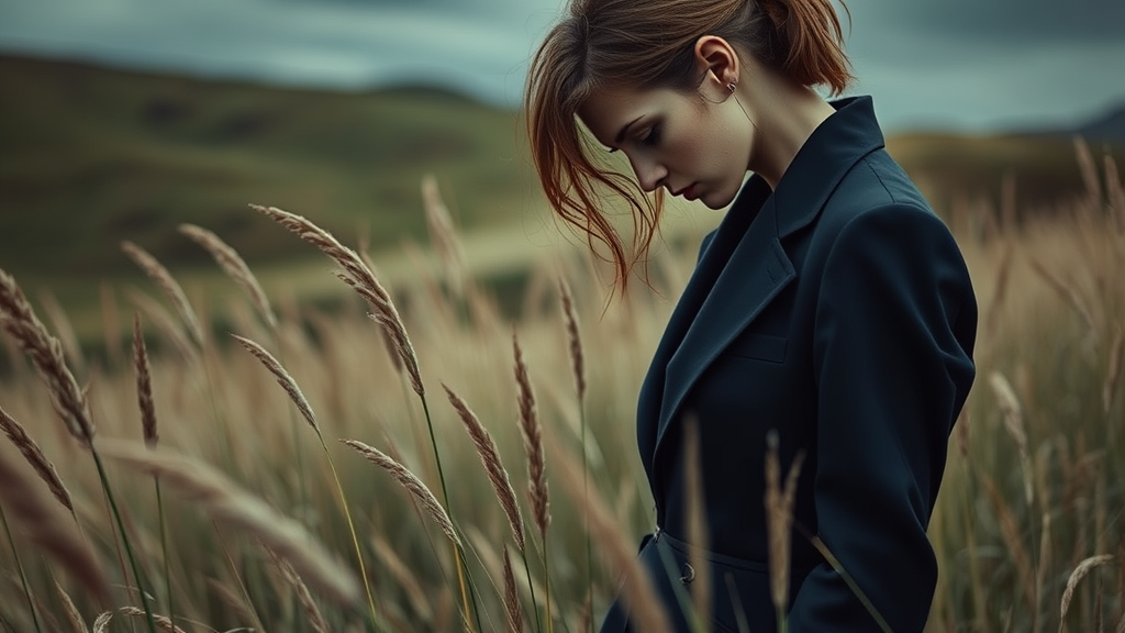 A person stands with their head bowed amidst the towering grass, blending the essence of fashion photography with sweeping Scottish landscapes. The scene is infused with hues of light bronze and deep blue, highlighting deconstructed tailoring that blurs gender boundaries. Captured in a series of close-up shots, the setting evokes a moody and pensive atmosphere, inviting contemplation and introspection amidst the natural beauty.