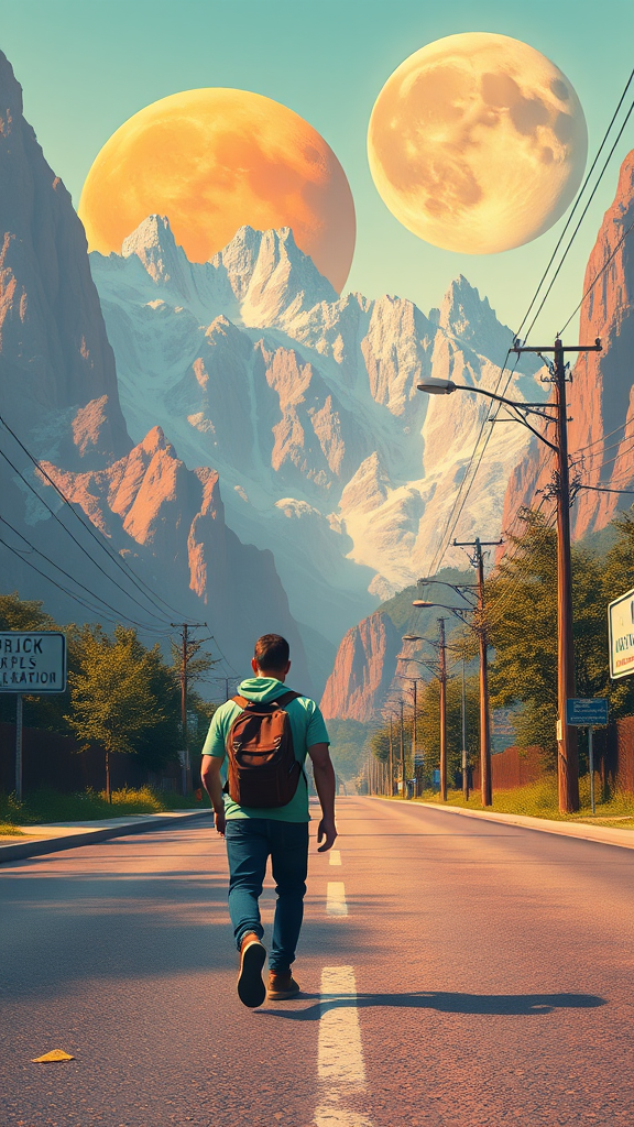 A person strolling down a street with majestic mountains in the background, reminiscent of Beeple's style, digital art with a beautifully detailed illustration featuring an orange planet and a giant moon. The scene is portrayed in a super detailed low-poly art style, capturing vibrant colors with a low resolution. The artwork contains text elements with a charming glitch effect, alongside distorted anatomy like missing or extra digits, adding a surreal touch. Composition includes cropped visuals, noticeable jpeg artifacts, and a playful nod to imperfections like extra limbs and poorly drawn hands. The illustration embraces a whimsical, out-of-frame perspective, with elements of tiling, deliberate deformations, and a mix of blurry and sharp contrasts. It incorporates signatures and watermarks, creating a narrative of artist identity amidst a disfigured and strangely captivating landscape.