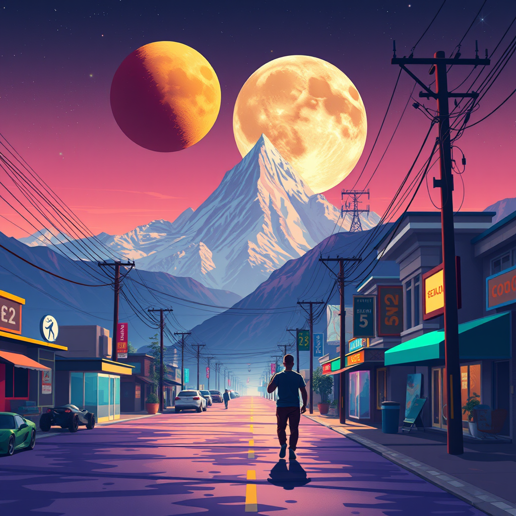 A person strolling down a vibrant street, mountains majestically rising in the background, inspired by Beeple's distinctive style, digital art showcasing intricate, vivid illustration. An orange planet hovers above, juxtaposed with a giant moon that dominates the skyline, rendered in exquisite detail through lowpoly art style. The scene conveys an otherworldly charm, with glimmers of abstract geometry blending seamlessly with realistic elements, while low-resolution artifacts add a touch of nostalgia. Despite occasional visual anomalies like text errors, and artistic quirks such as extra or missing digits, the overall composition remains captivating. Elements are intentionally cropped and mutated, giving a surreal, dream-like quality to the artwork, complete with blurred lines and delightful imperfections, such as watermarks and warped anatomy, evoking a sense of unconventional beauty.
