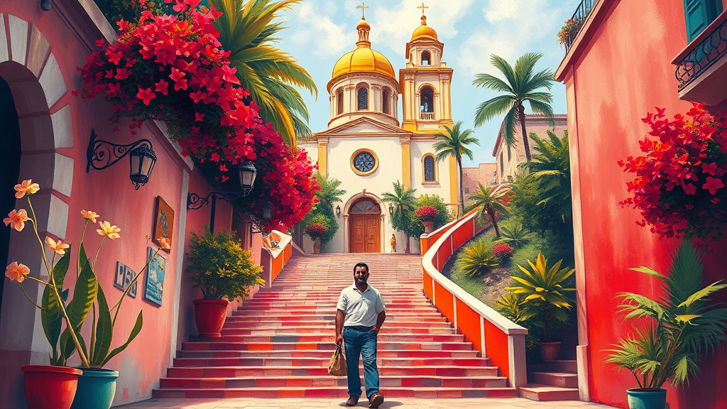 A person strolls down a vibrant street, where stairs meander past a church crowned with a golden-yellow roof, set against a backdrop rich with exotic flora and fauna. The scene exudes a Hispanicore charm, with hues of light red and white dancing across the canvas. Distinctive, expressive noses lend character to passersby, echoing the brushstrokes of Claude Monet with a post-impressionist flair. The dazzling cityscape unfolds with a dreamlike quality, capturing the essence of a bustling yet serene ambiance.