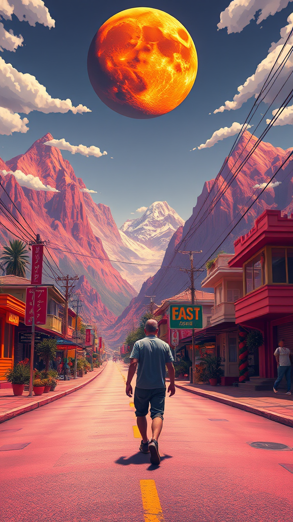 A person strolls down a vibrant street with majestic mountains in the distance, inspired by Beeple's style, showcasing a digital art scene with intricate details. A striking orange planet and a colossal moon dominate the sky above. The scene is crafted in super detailed low-poly art, exhibiting vivid colors with a slightly low-resolution texture, reminiscent of jpeg artifacts. Some text overlays, erroneous elements like missing or extra digits, and limbs can be spotted, adding a surreal touch. The composition occasionally features cropped elements, blurry details, and inaccurate anatomy, creating an abstract, almost mutated appearance. The eclectic scenery is both fascinating and unsettling, with hints of disfiguration, oddities, and an overall mysterious charm. A subtle signature and watermark suggest an artistic origin.