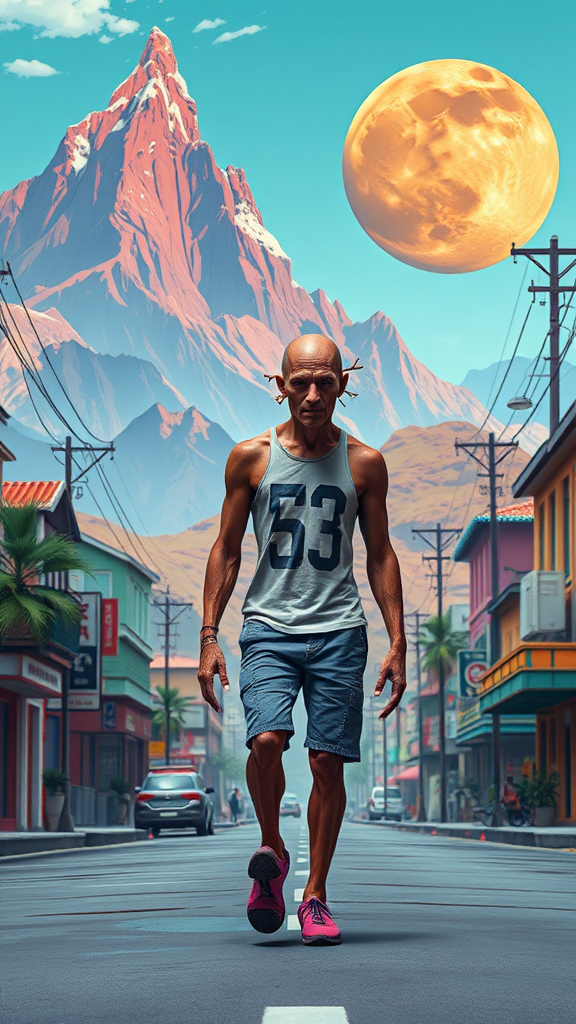 A person strolls down a vibrant street with majestic mountains towering in the background, inspired by Beeple's style. The scene is a digital art masterpiece, featuring a stunningly detailed illustration of an orange planet and a giant moon. It embraces a super detailed low-poly art style, rich in colors and textures. The artwork includes intentional imperfections like text errors, missing and extra fingers, and cropped elements. There are subtle jpeg artifacts and a barely visible signature adding to its authenticity. The person appears with unusual anatomy, including extra limbs and disfigured features, creating a surreal and abstract visual. Despite these features, the image is captivating with intentional blurriness and misshaped forms, capturing an otherworldly and strangely beautiful essence.