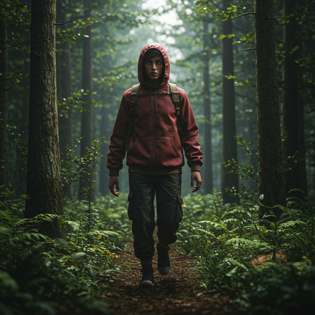 A person walking through a dense forest, their eyes beautifully detailed and expressive, captured in a high-definition, professional close-up shot. The image boasts ultra-high resolution with intricate colors, crafted using cinematic lighting and physics-based rendering techniques that give it a lifelike quality. The setting feels immersive, akin to an 8K CGI wallpaper, emphasizing breathtaking detail and clarity.