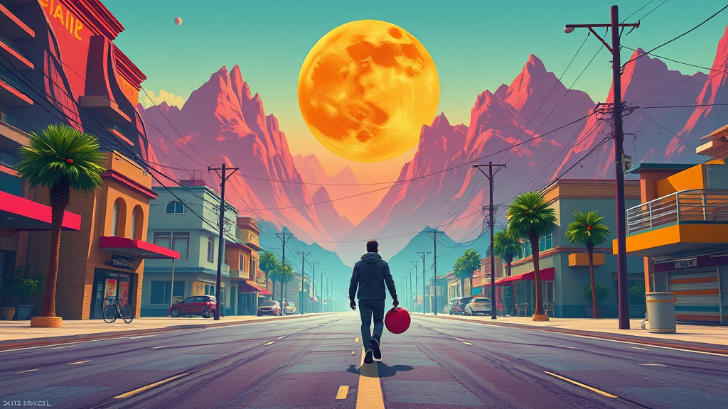 A person walks gracefully down a vibrant street with majestic mountains looming in the distance, reminiscent of the futuristic style of Beeple. The scene is captured in a stunning digital illustration, showcasing an orange planet and a colossal moon hanging in the sky. The artwork employs a super detailed lowpoly style with vivid colors and an abstract, slightly chaotic aesthetic. The image reveals subtle imperfections like text fragments, an extra digit here or there, and cropped elements. JPEG artifacts and an artist's signature add to its unique character. Inaccuracies like an extra limb or slightly distorted hands bring a whimsical touch, while certain features are curiously out of frame. The picture's blurry edges and hints of mutation evoke an intriguing and unconventional beauty, peppered with faint watermarks. This piece captures an otherworldly street scene, inviting viewers to explore its dreamlike landscape.