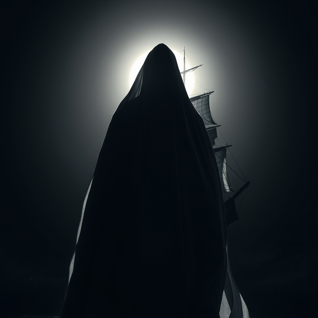 A person wrapped in a shroud-like material appears to merge with the air around them, creating a high contrast between the dark background and the radiant, luminous texture of the material, evoking a sense of emergence or transformation. Monochrome tones enhance the mysterious and intense atmosphere. This scene parallels the image of an ultra-realistic sailing ship under dramatic light during a pale sunrise. The cinematic lighting highlights its weathered and battered form, viewed from a low angle. Inspired by trending artworks on Artstation, this 4K hyper-realistic depiction features extreme details reminiscent of the Unreal Engine 5. A cinematic masterpiece that fuses the artistic intrigue of Studio Ghibli with the intricate technique of John William Turner, it invites subtle creative modifications while retaining its essence.