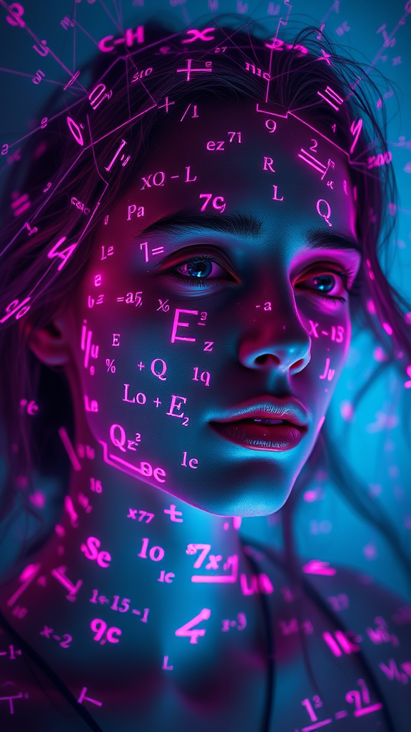 A person's face is surrounded by a web of iridescent holographic equations, glowing in vibrant DayGlo pink and black, as they cascade across their skin. The ambient background is a haunting mist, reminiscent of a digital ghost realm, where swirling forms and patterns reminiscent of Cinestill film bring an ethereal quality. These ever-evolving equations create a sense of dynamic symmetry, akin to navigating a fantastical world, generating an atmosphere of both high fantasy and mathematical precision.