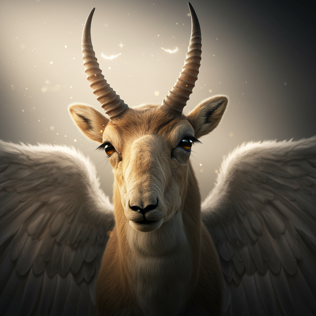 A phenomenally detailed studio portrait of a stunningly intricate saiga antelope depicted as a celestial angel, casting a playful and knowing smirk toward the viewer with luminous, richly detailed amber eyes. The portrait features exquisite detail and is illuminated by soft rim lighting, captured with remarkable realism and hyper-photorealism. Taken using a Canon DSLR at f/2.8, the image boasts the artistic styles of renowned photographers Felix Kunze and Annie Leibovitz, with expert retouching by Pratik Naik. Subtle celestial elements like gentle, ethereal light reminiscent of morning sunbeams play across the antelope's features, adding a whimsical touch to the majestic creature. The environment is minimalistic, drawing all focus to the expressive features and elaborate textures of the antelope's fur and wings, set against a soft, blurred backdrop that enhances the portrait's depth and artistry.
