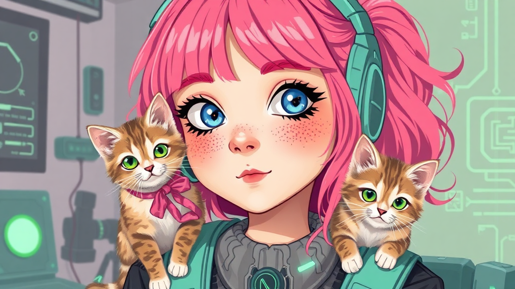 A photo-manipulated illustration of a quirky girl with vibrant pink hair, styled in flat shading reminiscent of Gemma Correll's work. Her face is adorned with playful freckles, and a curious cat perches comfortably on her shoulder. The setting is infused with a cyberpunk vibe, blending technology with whimsy. Soft pastel greens add a unique flair to the scene, which features subtle futuristic elements like glowing accessories and digitally inspired patterns. The girl's expression is one of lively curiosity, embodying a blend of eccentricity and charm in this imaginative portrait.