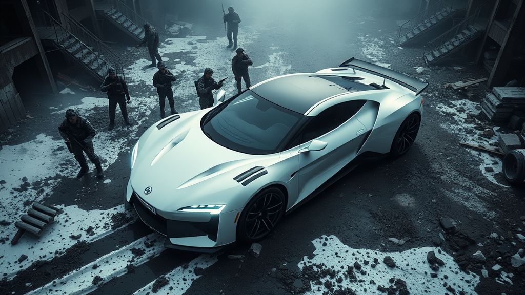 A photo of a futuristic car with sleek white paint, set in a dilapidated cityscape. The scene captures an ultra-realistic, high contrast ambiance with light fog drifting through the air. Snow and mud are scattered across the ground, while LED lights on the car illuminate the surroundings with a modern glow, accentuating the superb materials used in its design. Soldiers are visible on the ground amidst the destruction, adding a narrative layer to the scene. Shot from a bird's eye view, the top-level focal point offers a hyperdetailed and hyperrealistic perspective. The analog film photography style provides a large depth of field with intricate and high detail. The lighting is soft with subsurface scattering that enhances the realistic texture of the environment. Shadows are heavy, creating a stark contrast and emphasizing the golden ratio in the composition. This masterpiece is rendered in ultra-realistic 8k quality, blending elements of film photography with a touch of creative reinterpretation.
