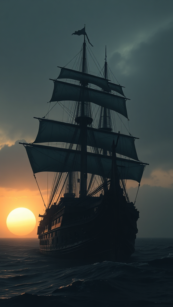 A photo of a hyper-realistic sailing ship under dramatic light, with a pale sunrise in the background. The scene is captured from a low angle, showcasing the ship's intricate details and battered textures, as if emerging from a storm. The cinematic lighting enhances the mysterious and intense atmosphere, reminiscent of a transformative journey. Monochromatic nuances highlight the ship's emergence against the dark oceanic backdrop, akin to a person enveloped in a luminous shroud. The piece is a masterpiece of complex artistry, blending the surreal mastery of Studio Ghibli with the intricate elegance reminiscent of John William Turner, trending on ArtStation, with extreme detail and unreal engine 5's rendering prowess.