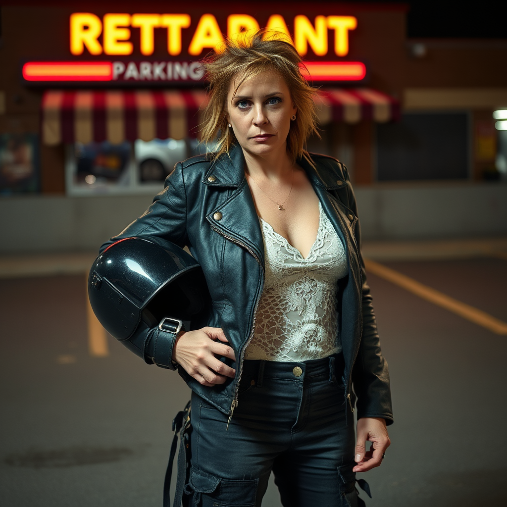 A photo of a middle-aged British woman exuding a punk and rebellious attitude, with a slightly disheveled look and an air of boredom. Her hair is styled in a messy, unkempt fashion, adding to her nonconformist vibe. She is dressed in a worn-out black leather jacket paired with rugged trousers and scuffed boots. Underneath the jacket, a glimpse of a white lace top hints at her edgy style. She holds a black helmet casually in one hand, as if ready to switch modes at any moment. Behind her, the dimly lit background reveals a restaurant parking lot, providing a gritty urban backdrop that complements her carefree and audacious persona.