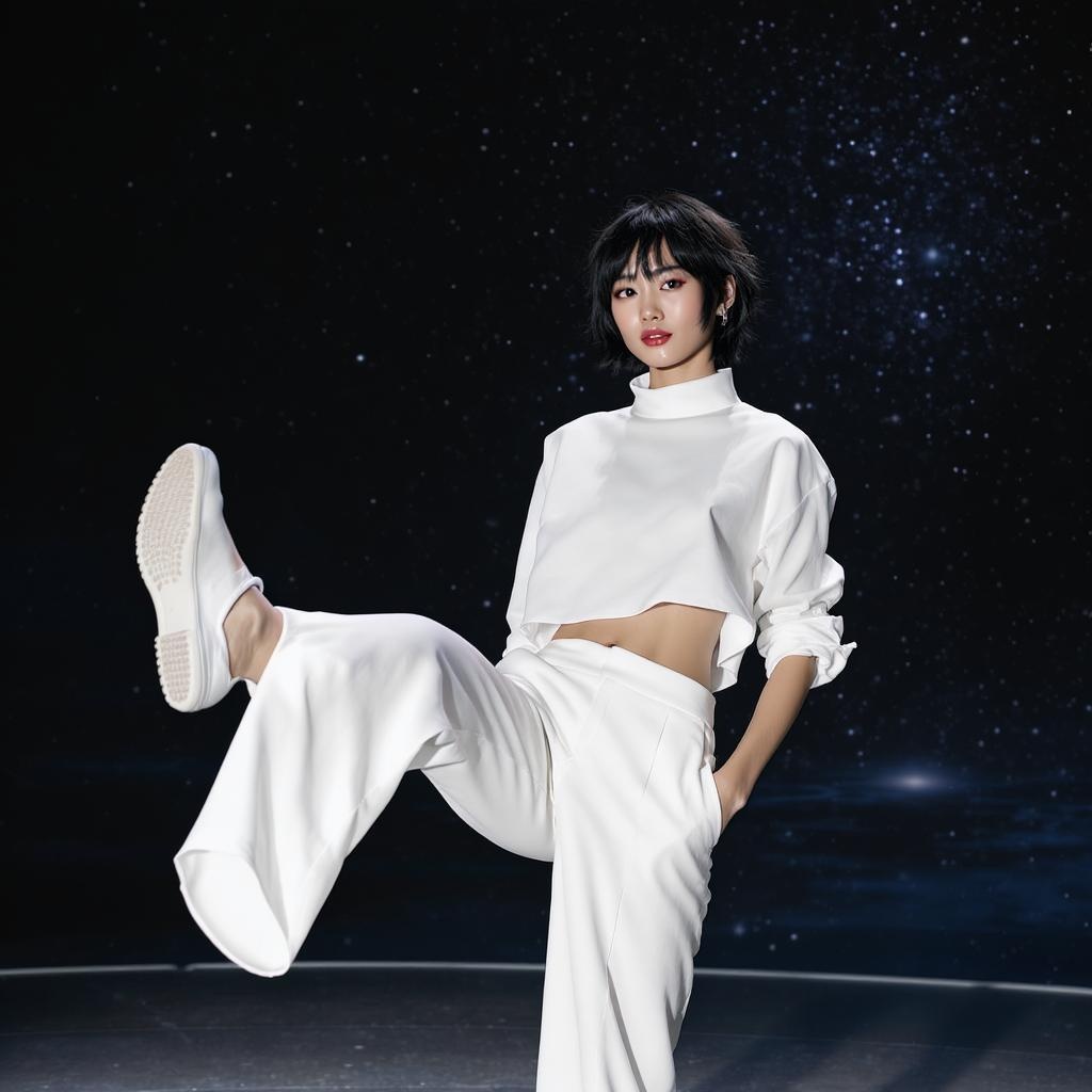 A photo of a slender young Asian female supermodel with a flat chest and toned abs, featuring short, tousled black hair. She is wearing a stark white, collarless tunic that reveals her midriff, paired with modernist tapered leg trousers. Her pose is dynamic as she playfully kicks one leg up behind her. The composition follows the rule of thirds, set against a Bauhaus-inspired theater stage. The backdrop is lit with a minimalist starry night sky, casting soft natural lighting on the model. The overall ambiance is sleek and contemporary, enhancing the sophisticated yet playful mood of the scene.