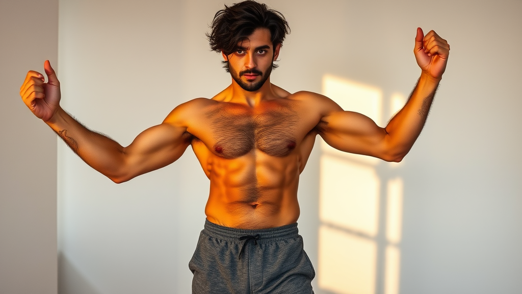 A photo of a striking Italian man with tousled black hair, showcasing a prominent hairy chest and muscular arms raised, revealing natural underarm hair. His well-defined abs are evident beneath snug charcoal shorts. Standing confidently in a minimalistic, white-walled room, the tattoos on his arms add an artistic flair. Captured in the golden hour of 2018, this full-body shot exudes a raw and unfiltered charm and makes for a memorable Snapchat post.
