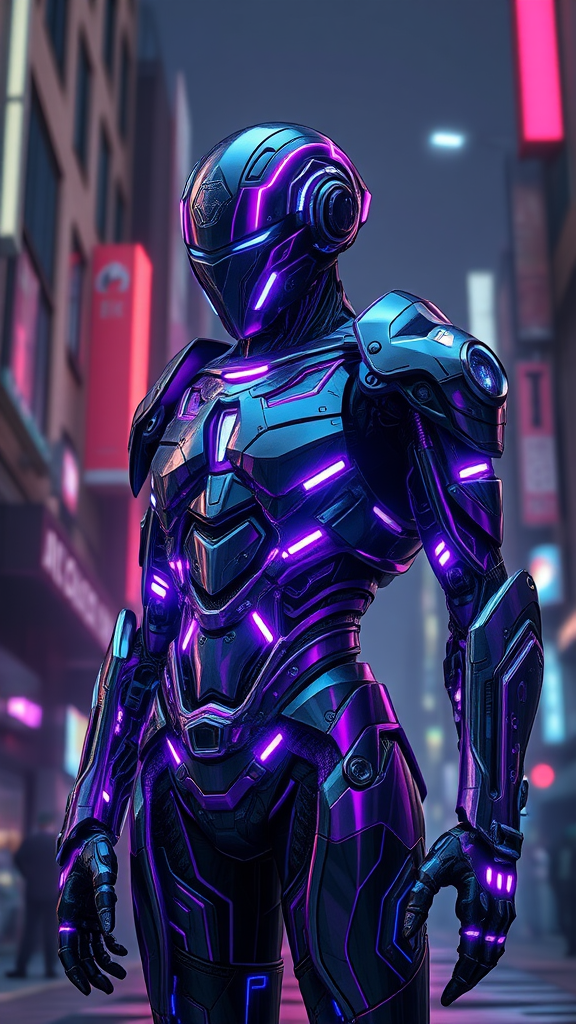 A photo of an 8k hyper-realistic cyberpunk android, showcasing a full-body view with complex purple and blue neon metallic armor that features intricate designs. The scene is illuminated with dramatic, cinematic lighting that highlights every detail, creating a mesmerizing visual impact. The android stands amidst a futuristic urban backdrop, with glimmers of neon lights reflecting off its surface, offering a high level of detail and focus, as if rendered in Unreal Engine 5. The composition is trending on art platforms like ArtStation, with a 4k resolution that emphasizes its hyperrealistic quality and the cinematic essence of an epic sci-fi narrative.