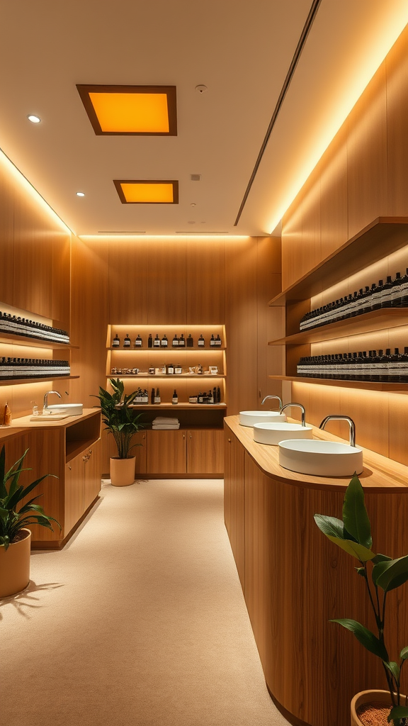 A photo of an Aesop-branded store design featuring a minimal interior space with warm, low-illumination indirect lighting. The main lighting consists of orange-colored square fixtures. The walls have a warm, soft, elegant finish in bronze, complemented by beige carpeting on the floor. A variety of products are thoughtfully displayed on both the walls and the bespoke Irish displays. The displays are elegantly curved with a wooden finish and include faucets and sinks, reflecting a sophisticated aesthetic. Minimalist plants are strategically placed to enhance the balance of shadows, creating a serene atmosphere. The scene captures every detail in UHD with an aspect ratio of 16:9, showcasing raw, unembellished style.