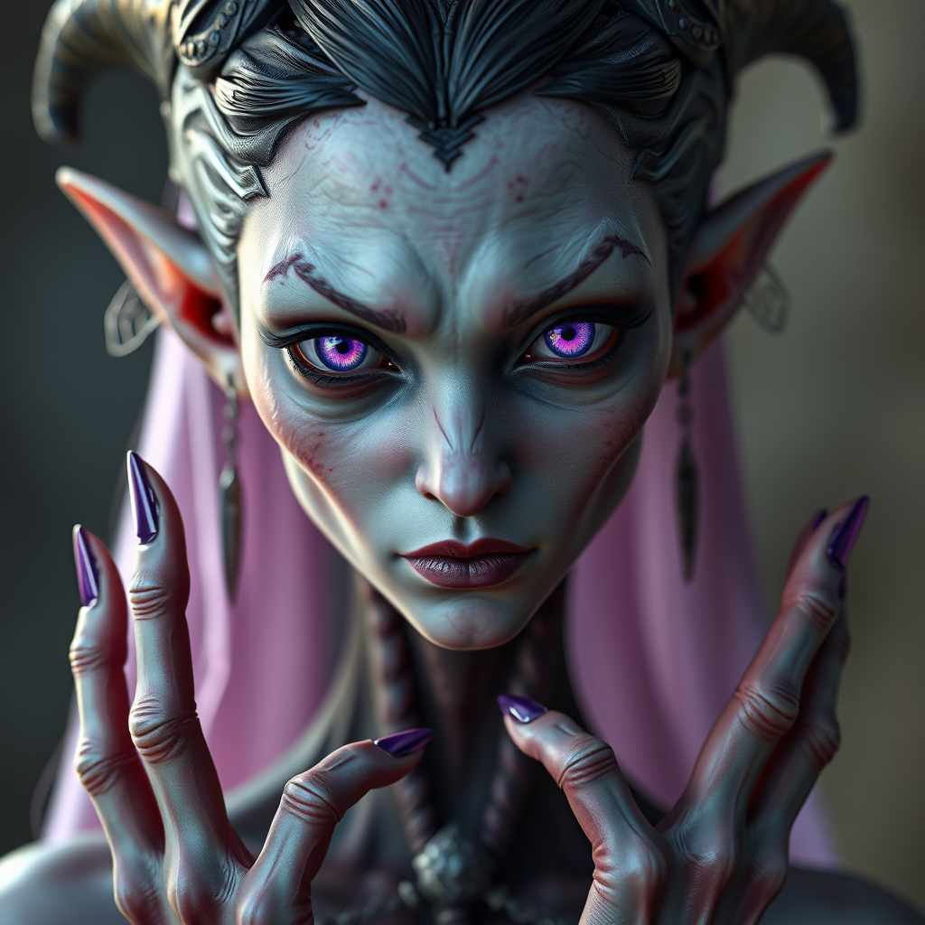 A photo-realistic depiction of a female drow elf with purple eyes, resembling a young Ann Miller. Crafted with extreme detail utilizing Unreal Engine and Octane, envision a full-body image that is zoomed out, captured with a 70mm lens to enhance the scene in 16k UHD HDR quality. The drow possesses distinct features but subtly mutated with a cloned face effect and slightly cross-eyed expression. Her elongated neck and hands with extra fingers add an unusual but captivating dimension to her appearance. Designed to be captivating without the presence of low resolution, artifacts, watermarks, logos, letters, words, cropped or split images, maintaining a clear and seamless presentation.