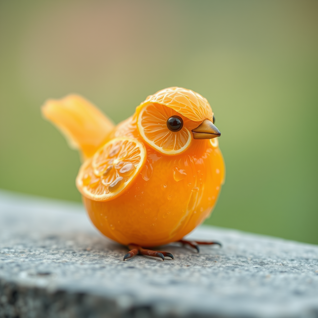 A photo-realistic depiction of a small bird crafted from a freshly sliced orange, its vibrant citrus flesh creating delicate feathers, with droplets of juice glistening in the light, a tiny beak formed from a piece of orange peel, and eyes suggested by careful placement of seeds, all set against a soft natural background, emphasizing the contrast between the lifelike bird and its fruity composition.